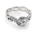A unique ring perfect for the nontraditional bride to be. The beautiful rose cut diamond flows into a white pave-set tribal weave. The intricate braided design is a work of art.