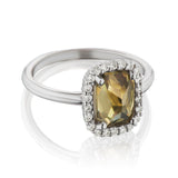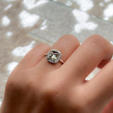 This unique ring is incomparable. The surrounding white diamonds contrast and enhance the color of the grey diamond center stone. This one of a kind grey diamond gives off tones of blues and greens and changes color in different lighting. It's a fabulous alternative engagement ring, or eye catching statement ring.