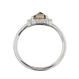Ready to ship with a 1.02CT grey diamond, with .22 CT total weight white diamonds, in 14kt white gold. Allow two weeks for finger size adjustment.