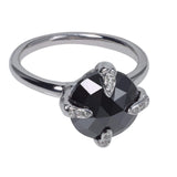 Gothic meets elegance with this stunning black rose cut diamond ring. The stone is gripped by white pave diamond claws. A fabulous alternative engagement ring, or a badass accessory!