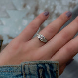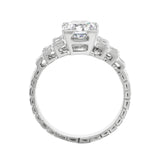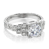 Stunning detail surrounds this art nouveau engagement ring. The step like design has pave diamonds cascading down the sides. Crafted with meticulous care, this ring is created using the same techniques as antique heirlooms, ensuring its timeless beauty and heirloom quality.