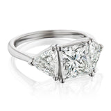 The 2.50 carat princess cut diamond center stone is perfectly matched with two trillion diamond side stones to complete the seamless design.