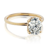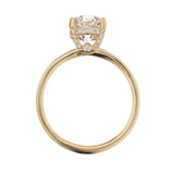 An absolutely stunning design with a 2.00 carat oval Moissanite center stone, set in elegant claw prongs for a refined, classic look. A hidden halo of natural diamonds, .20 carats total weight, adds a subtle accent.