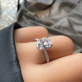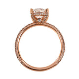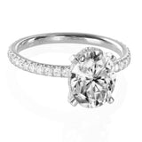 This romance inspired ring is refined, sophisticated and absolutely stunning from all angles. Delicately set diamonds surround the basket of the oval diamond and gently cascade along the band creating a beautiful and feminine ring.