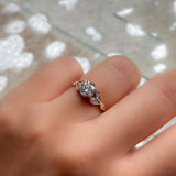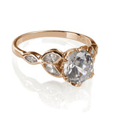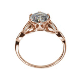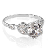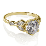 The center diamond is highlighted by marquise diamonds set in a leaf pattern. This lovely heirloom engagement ring merges the past and present resulting in the perfect balance of “something old” yet modern.