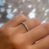 This unique, vintage inspired ring incorporates alternating marquise and round diamonds to achieve a striking contrast to more simple bands. This feminine wedding band can be worn as a compliment to an engagement ring, alone, or stacked with other bands to really stand out.