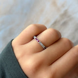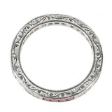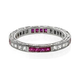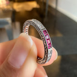 Set with a stunning combination of princess cut rubies and princess cut diamonds. This vintage style wedding ring is handmade with fine detail from all angles. The antique engraving on the sides makes it look and feel like an heirloom piece. Beautifully stacked or worn alone.