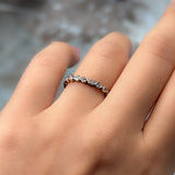 This vintage inspired ring incorporates alternating marquise and round diamonds to achieve a striking contrast to more simple bands. This feminine band can be worn as a compliment to an engagement ring, alone, or stacked with other bands to really stand out. Shown with .65CT total weight diamonds in 14kt yellow gold. Band width is 2.5mm. Available in all color metals and finger sizes.