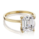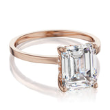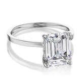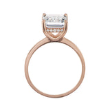 This elegant ring features a 3.00 carat emerald cut diamond with a hidden halo design. The delicate row of pave diamonds adds a touch of sparkle underneath the basket. The band is sleek and delicate, completing the overall minimalistic look.