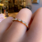 This unique wedding ring is vintage inspired, incorporating marquise diamonds set horizontally in a delicate setting. This striking design can be worn as a compliment to an engagement ring, alone, or stacked with other bands. Available to ship in 14kt yellow gold, with with .78CT total weight diamonds, finger size 5.75. Band width is 2mm.