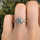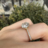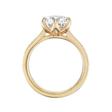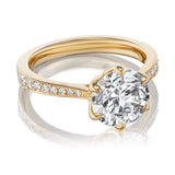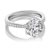 This handcrafted ring showcases a 2.07ct round lab-grown diamond set in a tulip-style basket. The cathedral design ensures it pairs seamlessly with most wedding bands. Side diamonds are .15cts total.