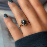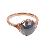 This rare cushion cut diamond is nestled in this edgy rose gold ring. White diamonds are splashed throughout this unique design creating a beautiful contrast in color and texture. Shown with a 2.62 carat grey diamond in 14K rose gold.